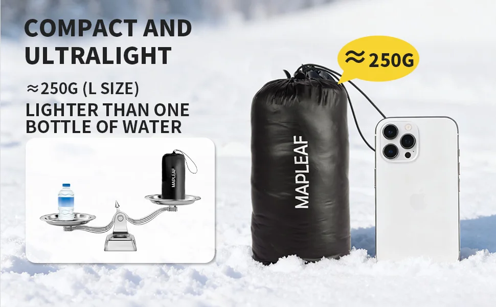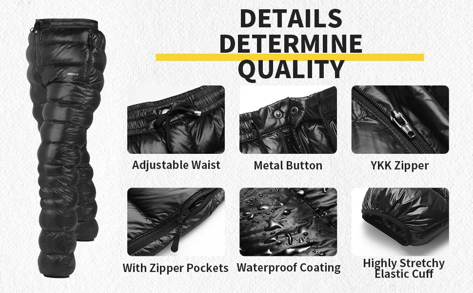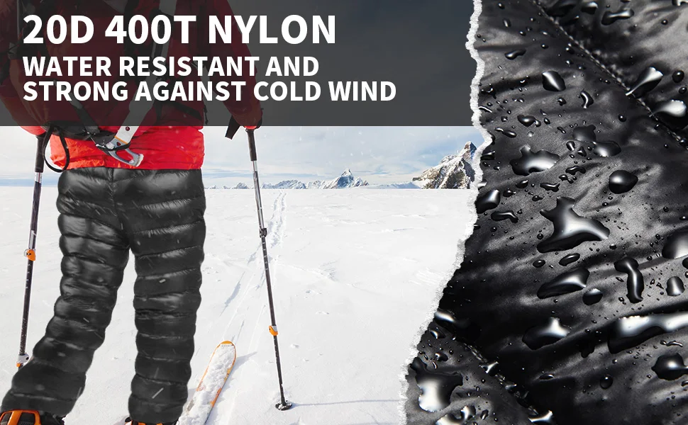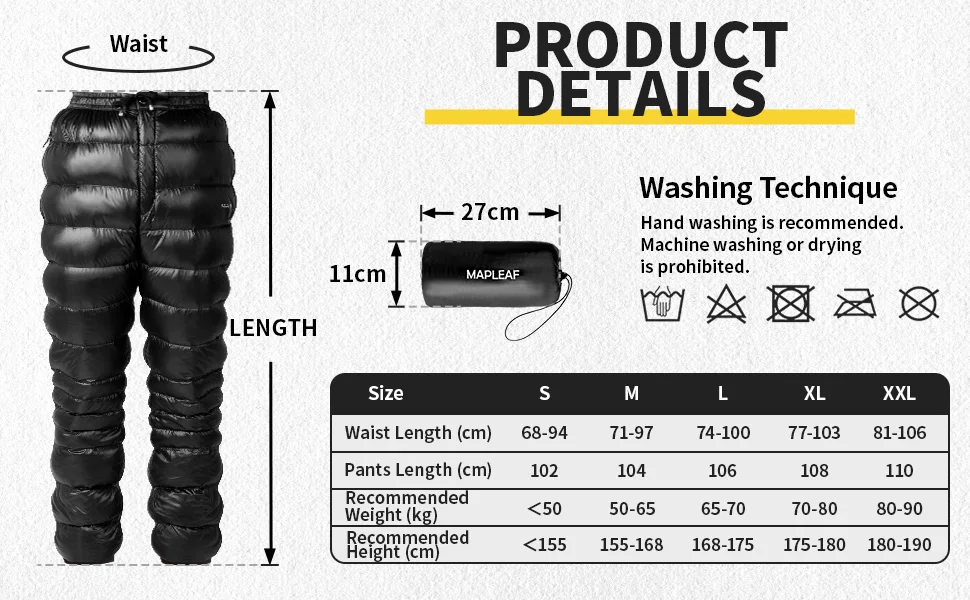 High-quality material: Mapleaf down pants are made of 20D 400T nylon, which is effectively windproof and waterproof. Filling with 90% 800FP white duck down, it is softer and more comfortable, ensuring warmth all day for any outdoor activities. Compact & Ultralight: Snow pants weight only 250g (L size), which is lighter than a bottle of 300ml mineral water. The stored size is 27x11cm, compact enough for your backpack or carry-on luggage. With YKK zipper pockets: There is a hidden zipper pocket on the left and right sides of the pants, allowing you to store small items such as mobile phone, keys, cards, etc. Specially using with YKK zippers, which are both smooth and durable.How to choose: There are three sizes to choose from: M (waist 71-97cm, length 104cm), L (waist 74-100cm, length 106cm), XL (waist 77-103cm, length 108). cm) ※Due to the adjustable elastic drawstring of the waistband, your waist circumference may be smaller than the minimum waist circumference. Please choose a more suitable length.Nice Choice As a Must-have: Ultralight down pants are compact and convenient to carry along for any outdoor adventures, outdoor camping, indoors, climbing, hiking, cycling, office crashing, home stay, disaster prevention, and more.